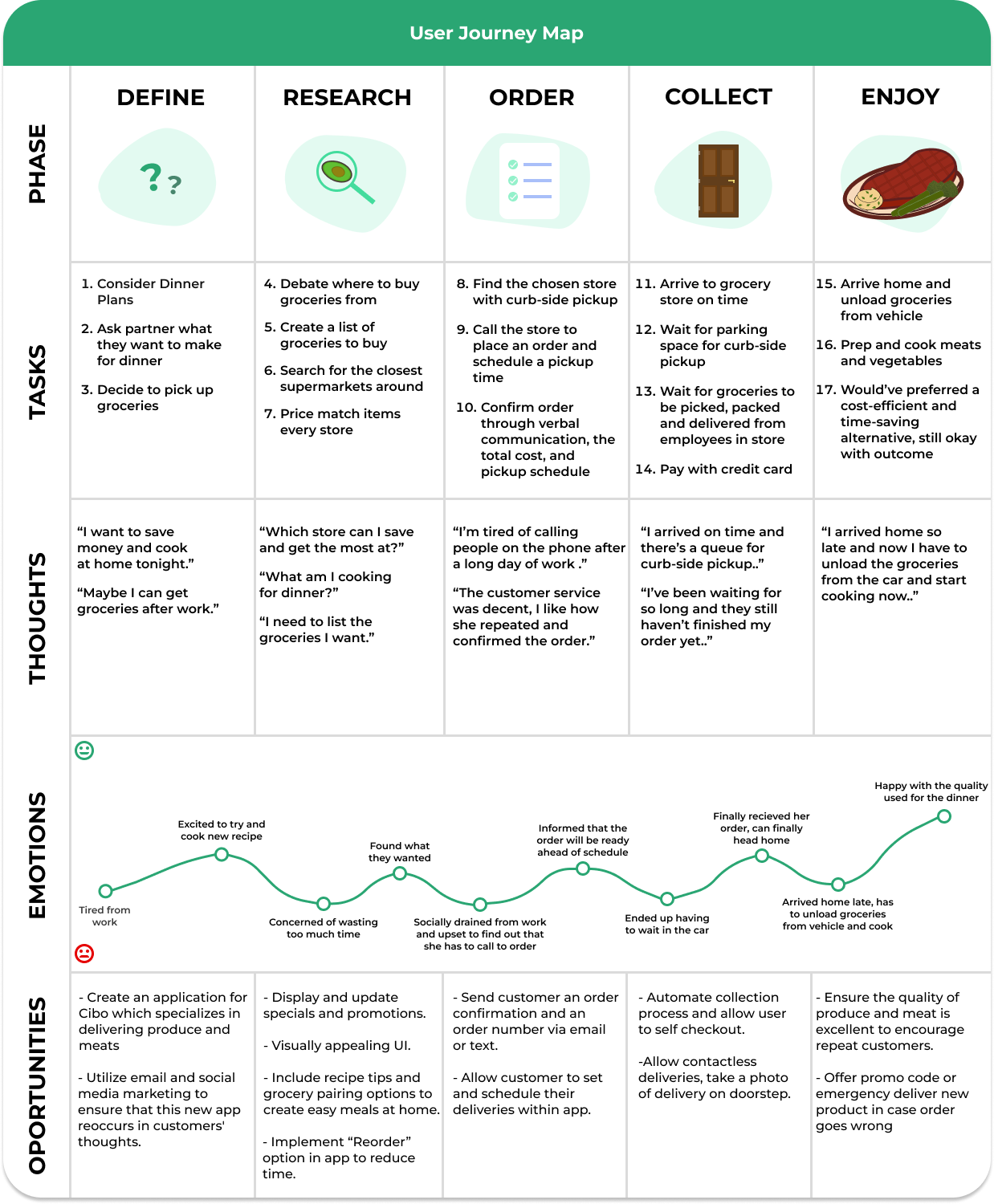 To start off this solo project, I decided to create a customer journey map to better understand my user and inform my design process. To do this, I interviewed a few friends with a series of questions to ask how they commonly bought their groceries and how they felt about it. Predictably, many still rushed around their local supermarket with carts because these stores weren’t on existing produce delivery platforms, but they would prefer being able to order online. I decided to incorporate this into my user journey.